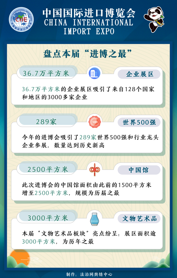 第六屆進(jìn)博會(huì)將創(chuàng)造多個(gè)“歷史之最”:今年進(jìn)博會(huì)企業(yè)展的展覽面積達(dá)到36.7萬(wàn)平方米,吸引了128個(gè)國(guó)家和地區(qū)的3000多家企業(yè),規(guī)模為歷史之最;289家世界500強(qiáng)和行業(yè)龍頭企業(yè)參展,數(shù)量達(dá)到歷史新高;中國(guó)館升級(jí)擴(kuò)容,展覽面積由此前的1500平方米增至2500平方米,規(guī)模為歷屆之最;“文物藝術(shù)品板塊”的展區(qū)面積逾3000平方米,為歷屆之最。