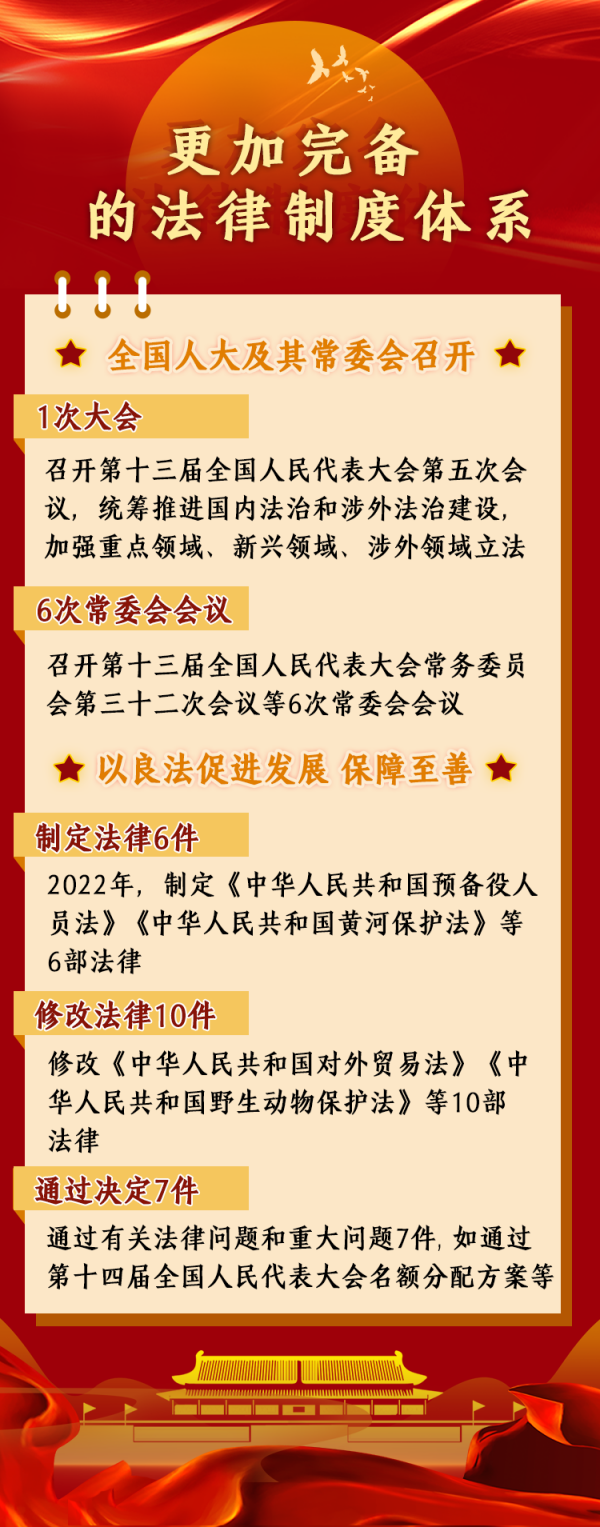 據(jù)統(tǒng)計,2022年,全國人大及其常委會召開了1次大會和6次常委會會議,統(tǒng)籌推進國內(nèi)法治和涉外法治建設,加強重點領域、新興領域、涉外領域立法,制定法律6件,修改法律10件次,作出法律解釋1件,通過有關法律問題和重大問題決定7件,法律制度體系更加完備。