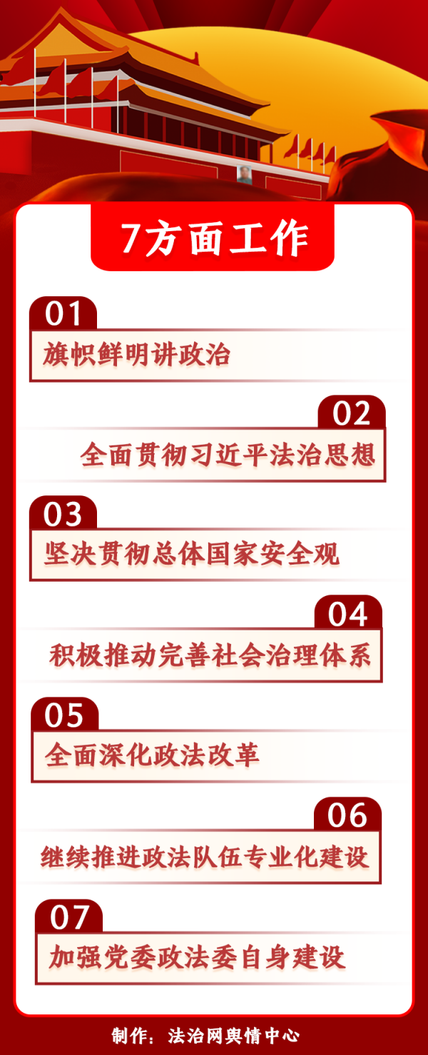 會議要求抓好七方面工作:旗幟鮮明講政治;全面貫徹習(xí)近平法治思想;堅決貫徹總體國家安全觀;積極推動完善社會治理體系;全面深化政法改革;持續(xù)推進(jìn)政法隊伍專業(yè)化建設(shè);加強(qiáng)黨委政法委自身建設(shè)。