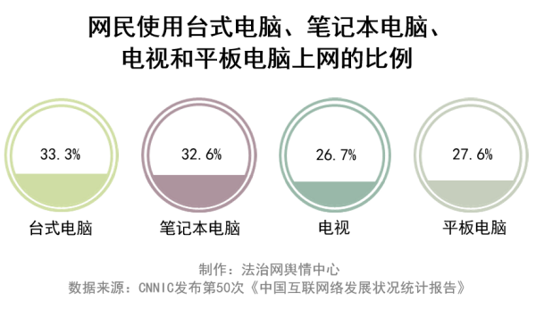 隨著智能手機普及,移動網(wǎng)絡(luò)速度大幅提升,網(wǎng)絡(luò)接入環(huán)境變得多元。據(jù)第50次《報告》顯示,我國手機網(wǎng)民已達到10.47億,占總體的99.6%;使用臺式電腦、筆記本電腦、電視和平板電腦上網(wǎng)的比例分別為33.3%、32.6%、26.7%和27.6%。