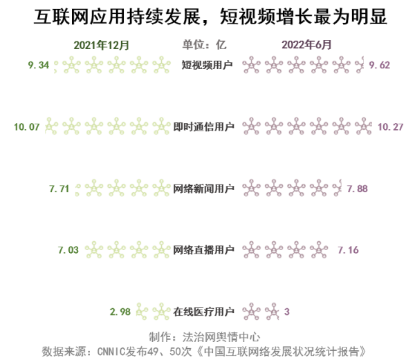 近年來,互聯(lián)網(wǎng)應(yīng)用場景得到極大豐富,短視頻既迎合了互聯(lián)網(wǎng)發(fā)展規(guī)律,又滿足了人們對多樣化的內(nèi)容需求,用戶數(shù)量不斷攀升。據(jù)第50次《報告》顯示,截至2022年6月,我國短視頻的用戶規(guī)模增長明顯,達9.62億,較2021年12月增長2805萬,其用戶規(guī)模增長量在即時通信用戶(2042萬)、網(wǎng)絡(luò)新聞用戶(1698萬)、網(wǎng)絡(luò)直播用戶(1290萬)、在線醫(yī)療用戶(196萬)幾大群體中居首。