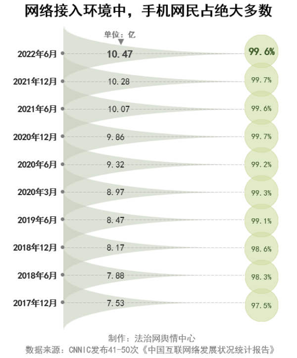 從2017年12月到2022年6月網(wǎng)民規(guī)模對比數(shù)據(jù)可以看出,我國網(wǎng)民規(guī)模持續(xù)增長。2020年12月相較于2020年6月網(wǎng)民增長數(shù)量更是突破了4900萬人。