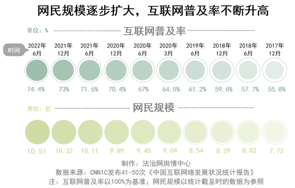隨著互聯(lián)網(wǎng)的不斷普及,我國網(wǎng)民規(guī)模持續(xù)增長。據(jù)41次-50次(2017年12月-2022年6月)《報告》顯示,截至2022年6月,我國互聯(lián)網(wǎng)普及率已達74.4%,較2021年12月提升1.4個百分點,網(wǎng)民規(guī)模達10.51億。