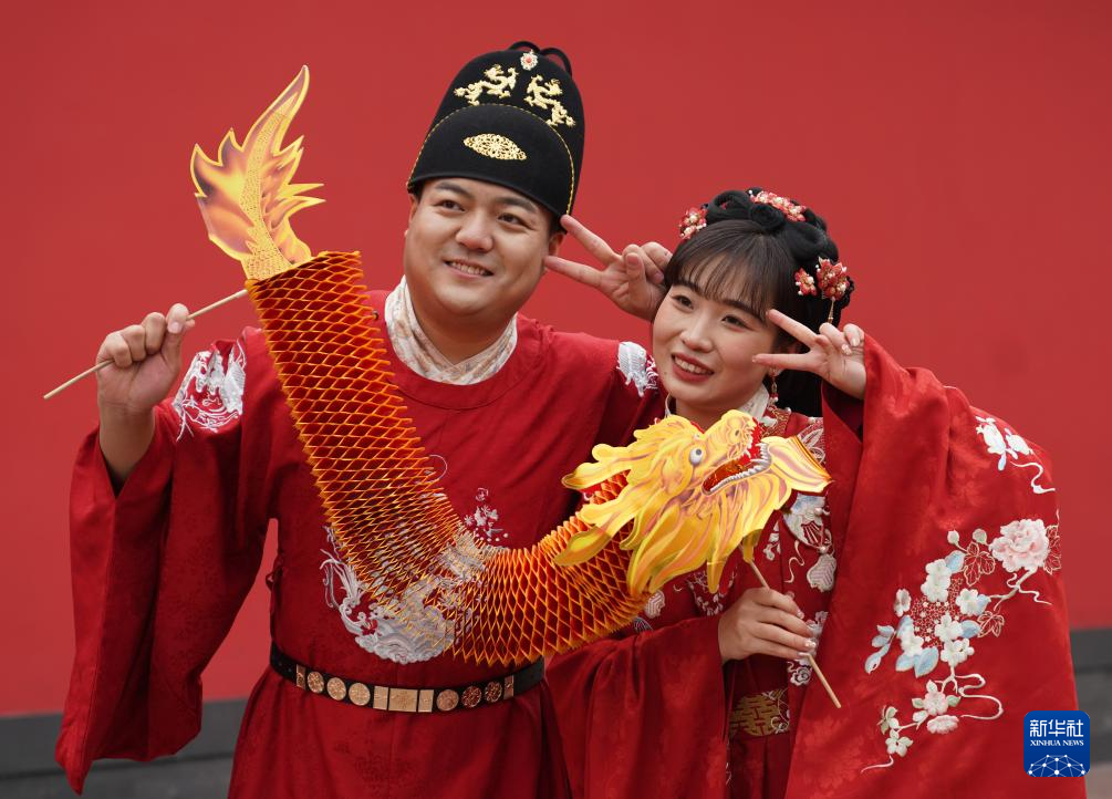 1月15日,杭州南宋德壽宮遺址博物館外,一對(duì)新人手持道具龍拍照。