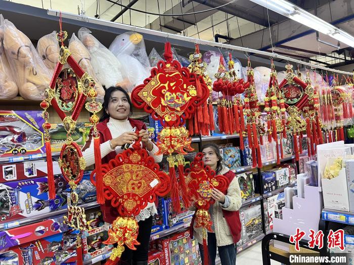 春節(jié)臨近,新疆阿圖什市的大街小巷年味濃。采購(gòu)年貨正當(dāng)時(shí),瓜果蔬果、新春掛件等年貨紛紛被各大商超上架,供市民采購(gòu)。