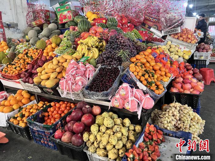 來(lái)到當(dāng)?shù)刂牟└窭r(nóng)貿(mào)市場(chǎng),只見(jiàn)各類(lèi)水果早已堆滿(mǎn)貨架,靜待市民“置年貨”。張峰 攝