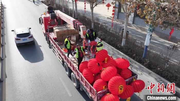 為喜迎春節(jié),營(yíng)造“年味兒”,阿圖什城建局工作人員早早動(dòng)工,為當(dāng)?shù)馗鱾€(gè)街道張燈結(jié)彩掛燈籠。張峰 攝