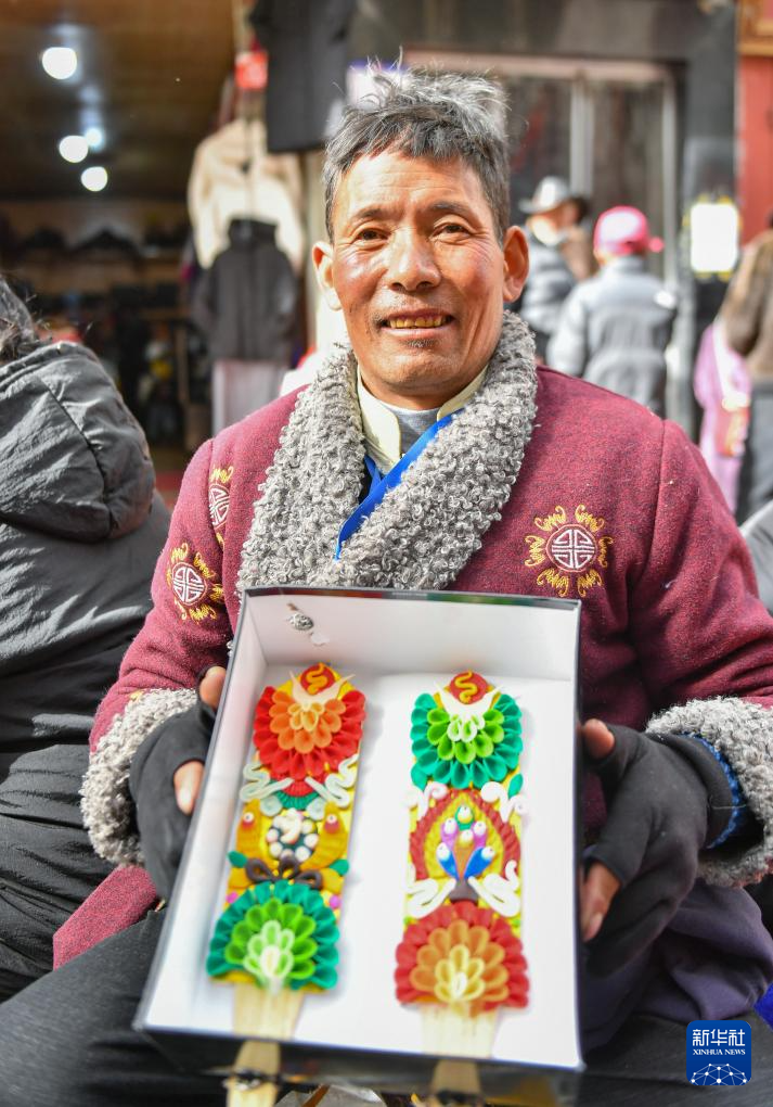 2月7日,在拉薩八廓商城,商販在展示售賣的酥油花。