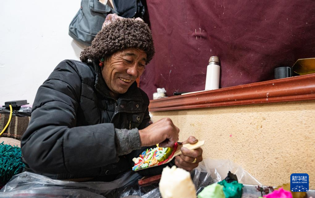 2月7日,在拉薩八廓商城,手工藝人在制作酥油花。