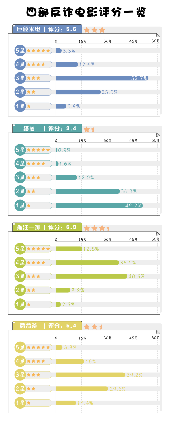 據(jù)豆瓣用戶對四部電影的評分,截至2024年2月1日,《孤注一擲》以總得分6.9位居四部電影之首,其余三部均在6分以下。分析評分構(gòu)成發(fā)現(xiàn),給出“三星”的網(wǎng)民不在少數(shù),“中規(guī)中矩”似乎成為了反電詐電影的標(biāo)簽。
