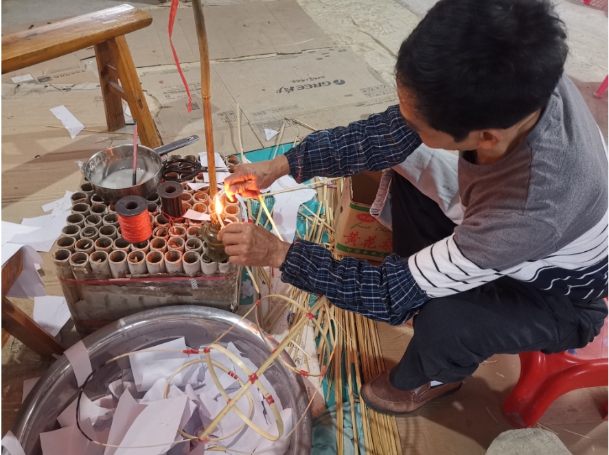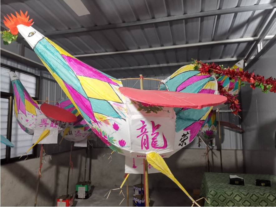 “客家方言中,‘燈’與‘丁’同音,雞公燈也寓意著財(cái)丁興旺。”周芙明用粗細(xì)不一的竹子編出公雞外形,在竹架上糊上白紙,之后再上色,一個(gè)雞公燈便制作完成了。