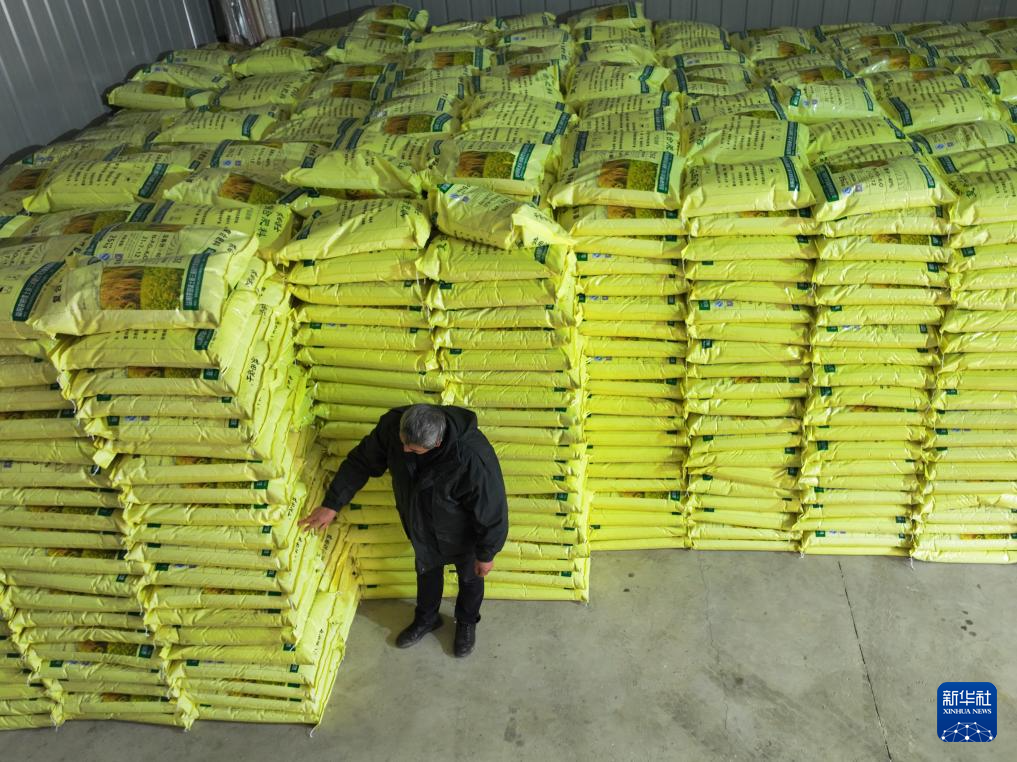 2月25日,在湖南省益陽市赫山區(qū)農(nóng)田謀士水稻專業(yè)合作社,工作人員在查看復(fù)合肥料儲備情況(無人機照片)。