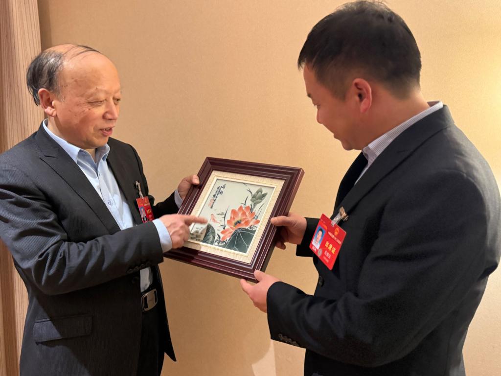 3月3日,全國人大代表、景德鎮(zhèn)陶瓷發(fā)展中心主任于集華(左)向參會代表講述景德鎮(zhèn)陶瓷文化。新華社記者 賴星 攝