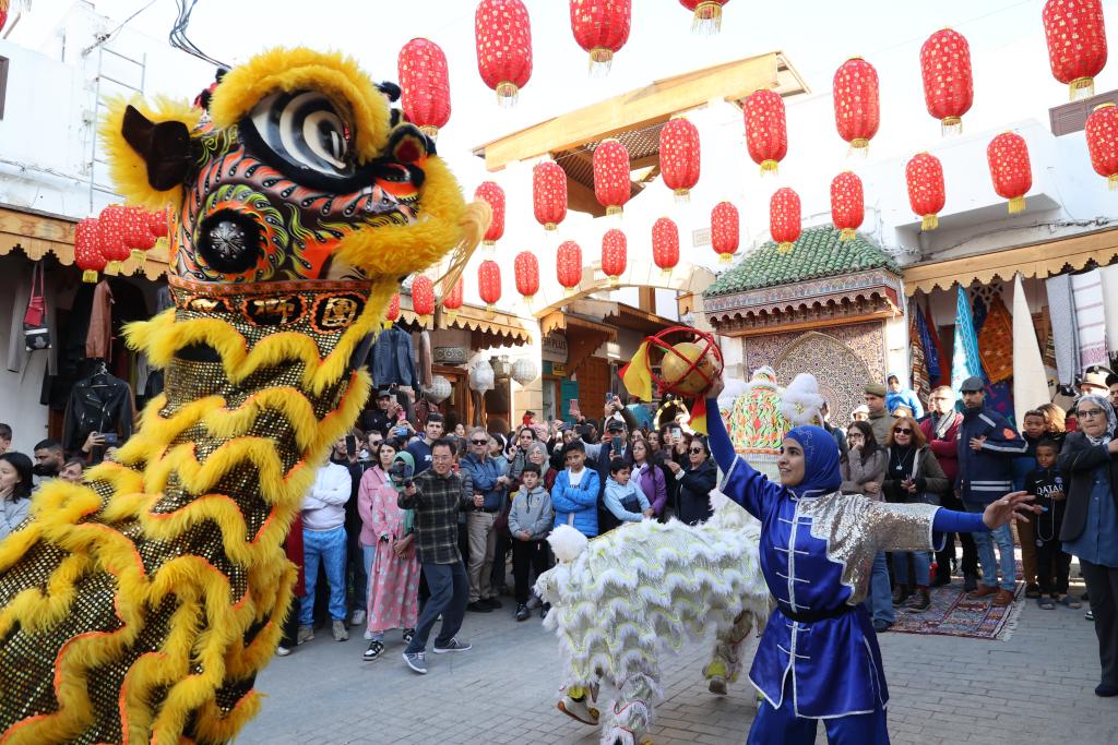 1月22日,人們在摩洛哥首都拉巴特老城里觀看舞獅表演。當日,由中國文化和旅游部、中國駐摩洛哥大使館主辦的2024摩洛哥“歡樂春節(jié)·中國廟會”活動在摩洛哥首都拉巴特開幕,迎接即將到來的中國農(nóng)歷龍年春節(jié)。新華社記者 霍晶 攝