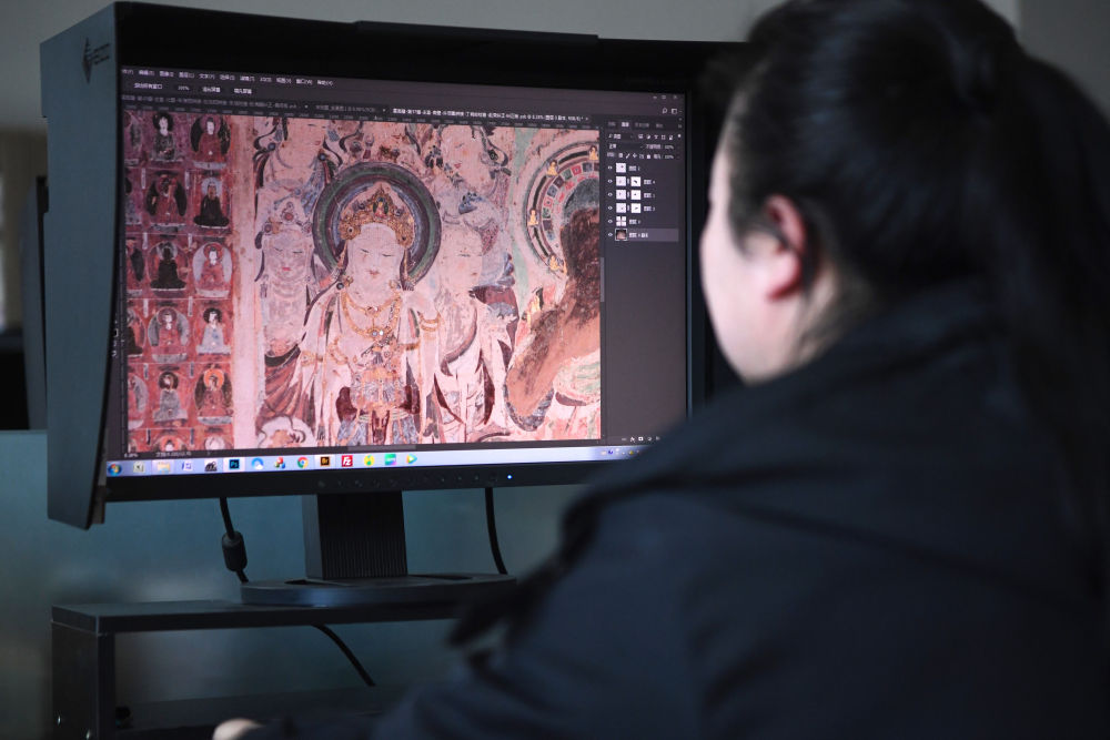 敦煌研究院文物數(shù)字化保護團隊圖像處理人員年海麗在拼接壁畫圖像(2023年4月25日攝)。新華社記者 陳斌 攝