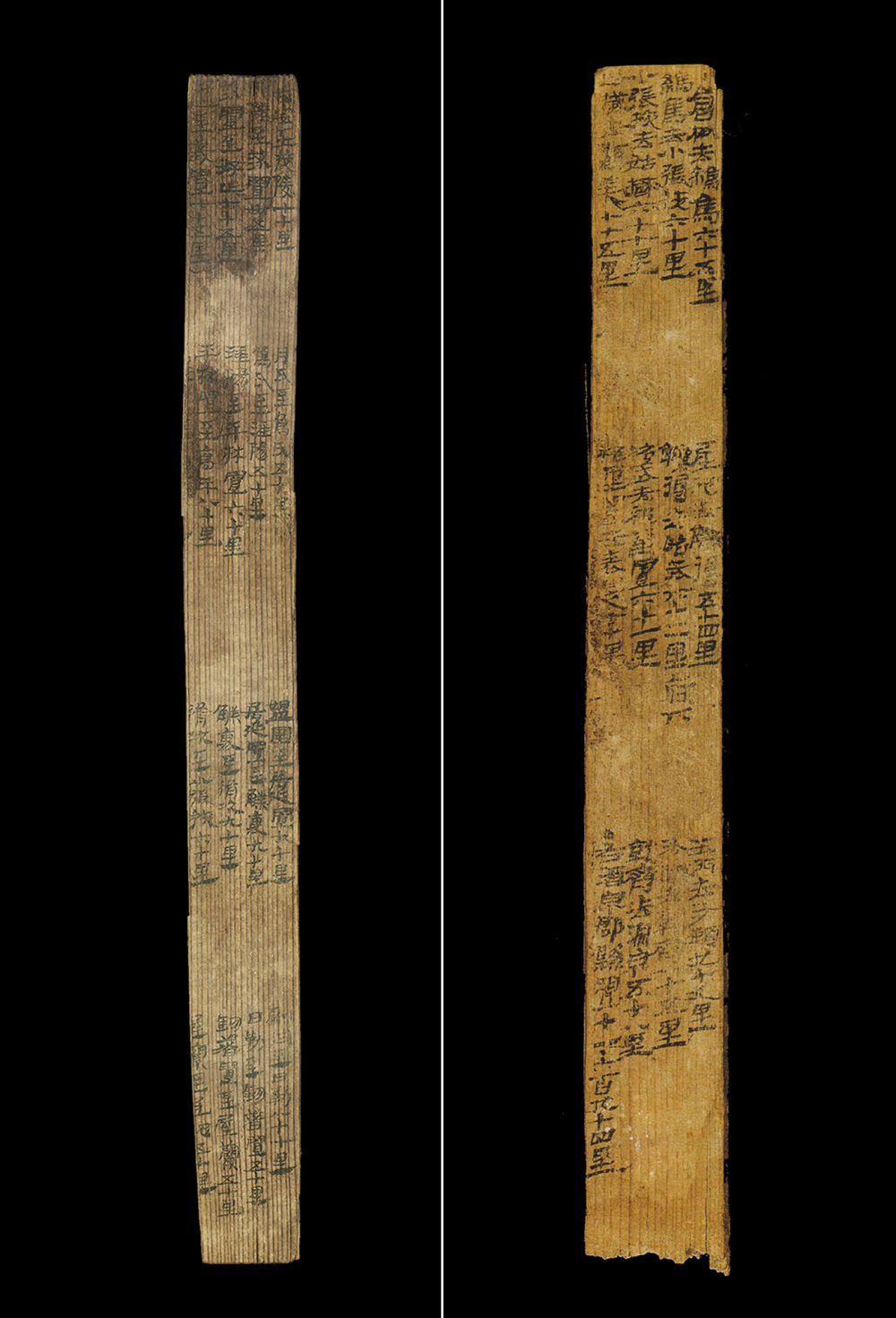 拼版照片:漢簡《居延里程簡》(左圖)和《懸泉里程簡》。1974年出土于今內(nèi)蒙古自治區(qū)額濟納旗破城子遺址的“居延里程簡”,詳細記載了從漢代長安出發(fā)至張掖郡20個驛置名稱及間隔里程。1990年出土于敦煌懸泉置遺址的“懸泉里程簡”,記載了河西走廊地區(qū)武威郡到敦煌郡12個驛置的詳細信息。新華社發(fā)(甘肅簡牘博物館供圖)