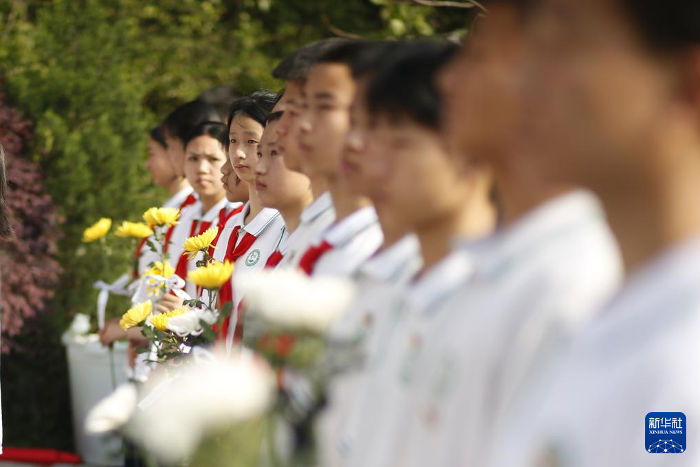 4月2日,在貴州省黔東南苗族侗族自治州劍河縣烈士陵園,學生們在烈士紀念碑前緬懷先烈。