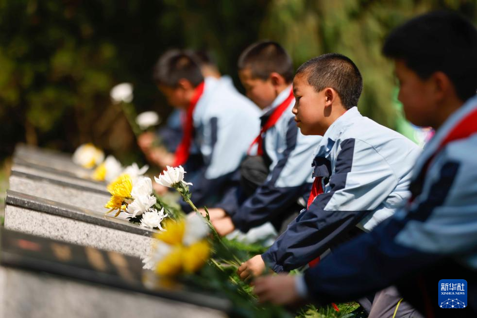 4月2日,在貴州省黔東南苗族侗族自治州施秉縣白垛鄉(xiāng),學(xué)生向紅軍烈士墓獻(xiàn)花。