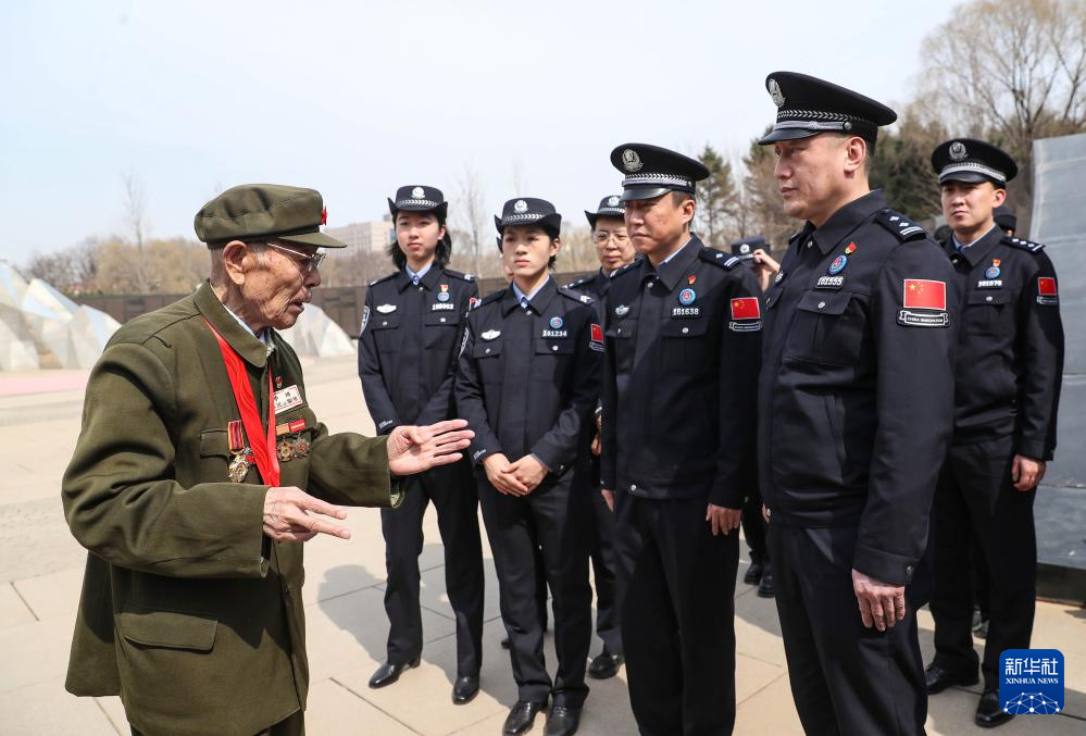 4月2日,在沈陽抗美援朝烈士陵園,志愿軍老戰(zhàn)士金東輝(左一)為沈陽出入境邊防檢查站民警講述戰(zhàn)斗故事。