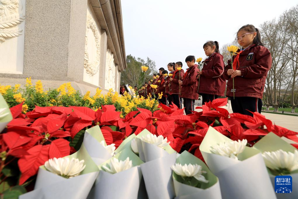 4月2日,在位于河北省石家莊市的華北軍區(qū)烈士陵園,學生們?yōu)楦锩⒘耀I花。