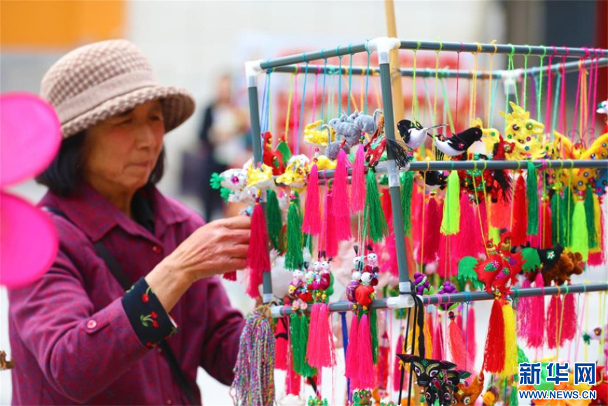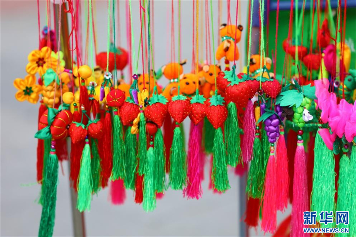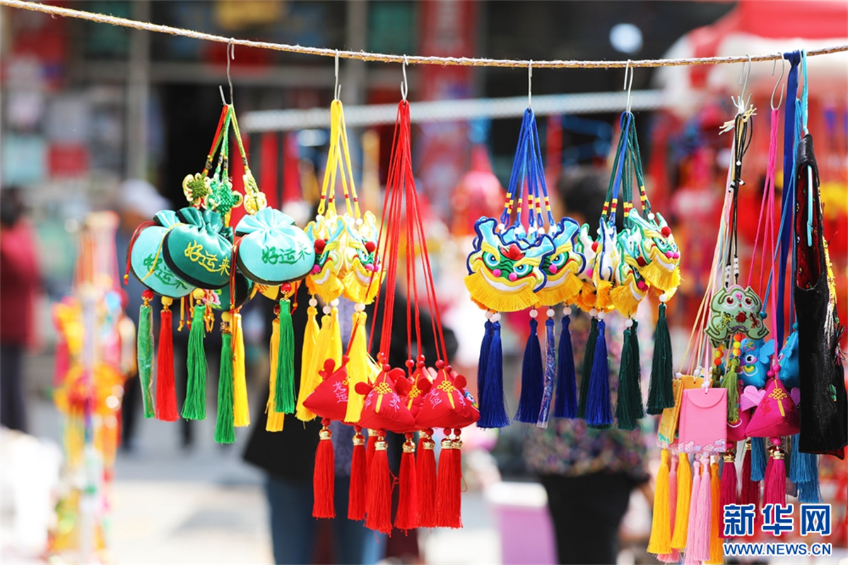 端午節(jié)臨近,甘肅省平?jīng)鍪兄行某菂^(qū)的攤位上掛滿了各式各樣的香包、手鏈等,色彩斑斕、醇香撲鼻,吸引不少市民前來(lái)選購(gòu)。新華網(wǎng)發(fā)(祁秋謹(jǐn) 王靖樂(lè) 攝)