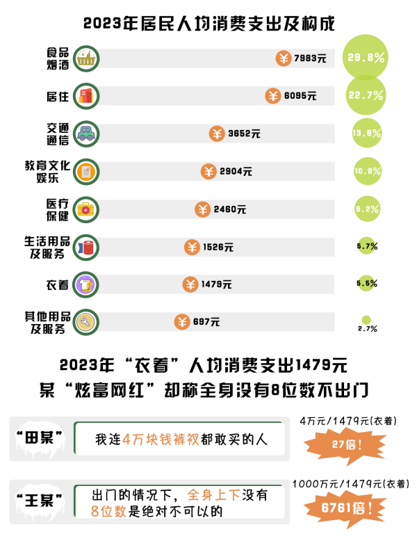以上網(wǎng)紅炫耀的消費能力遠超普通居民的人均購買力,成為過著“茶米油鹽醬醋茶”生活的工薪者們不可觸及的“夢”。