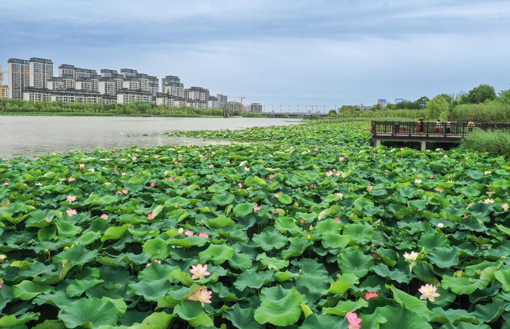 6月21日,陜西省富平縣石川河國(guó)家濕地公園內(nèi)荷花盛開。新華社記者 李賀 攝