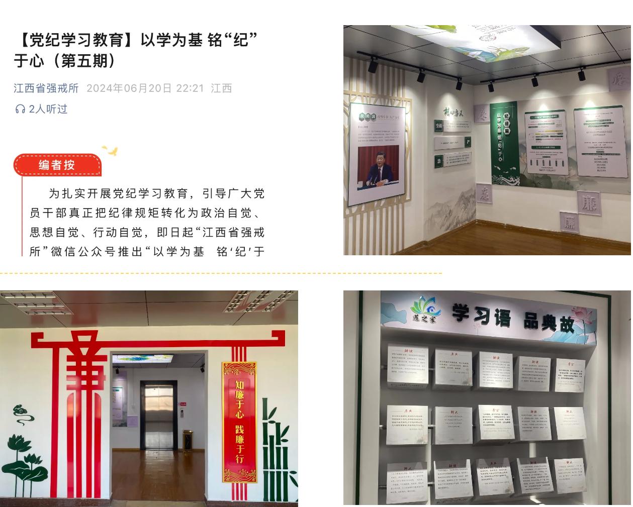 江西省強戒所把開展黨紀(jì)學(xué)習(xí)教育作為重要政治任務(wù),緊盯學(xué)習(xí)重點,拓展學(xué)習(xí)形式,注重學(xué)用結(jié)合。依托所微信公眾號、所內(nèi)網(wǎng)、LED顯示屏等媒介推送黨紀(jì)知識,開設(shè)“以學(xué)為基 銘‘紀(jì)’于心”、黨紀(jì)學(xué)習(xí)教育專欄等;綜合運用圖文、音頻、視頻等形式,通過講、寫、學(xué)、測等方式展現(xiàn)學(xué)習(xí)教育成效,構(gòu)建全方位宣傳矩陣,營造全員參與、人人學(xué)紀(jì)的濃厚氛圍。