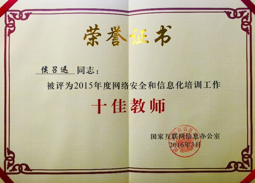 2016年3月,獲中央網(wǎng)信辦頒發(fā)2015年度網(wǎng)絡(luò)安全和信息化培訓(xùn)工作“十佳教師”證書。