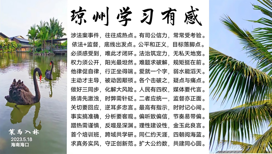 2020年9月22日,參加中央網(wǎng)信辦、中央政法委指導(dǎo)的“大國小鮮 基層之治”網(wǎng)絡(luò)主題宣傳活動,發(fā)言提出:社會治理就是“烹小鮮”,這個(gè)看起來很大的題目,核心還是人,每一個(gè)人的合理需求和合法權(quán)益都是社會治理服務(wù)的對象。依法維護(hù)廣大人民群眾和一家一戶一人的合法權(quán)益,才能真正維護(hù)和諧安定的社會秩序。守護(hù)好萬家燈火就是我們工作和服務(wù)的內(nèi)涵,用繡花針工夫做好社會治理大文章。媒體通過作品的傳播力、影響力、公信力,真實(shí)還原治理一線“烹小鮮”行為,生動呈現(xiàn)基層守正創(chuàng)新、擔(dān)當(dāng)作為的故事細(xì)節(jié),同時(shí)以共情力和同情心洞察百姓期待與訴求。