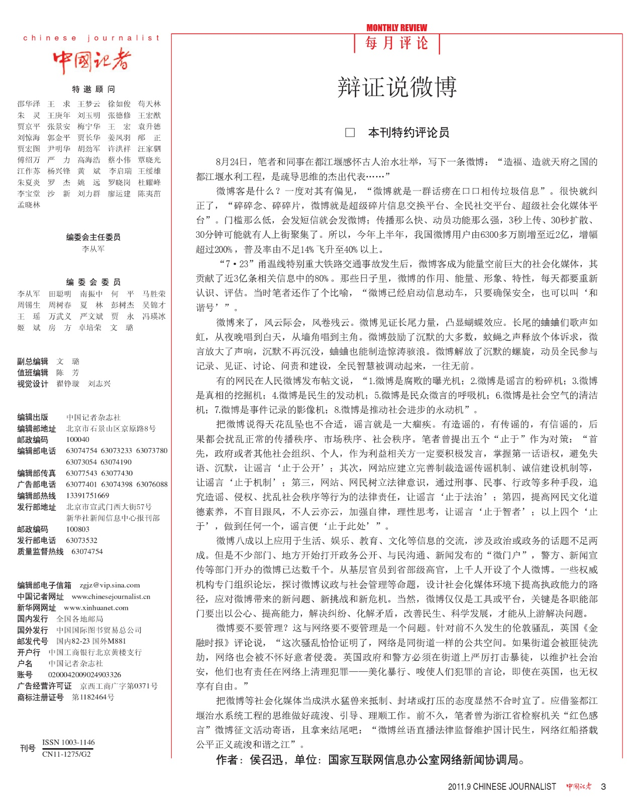 《中國記者》2011年第9期“每月評論”刊發(fā)《辯證說微博》。
