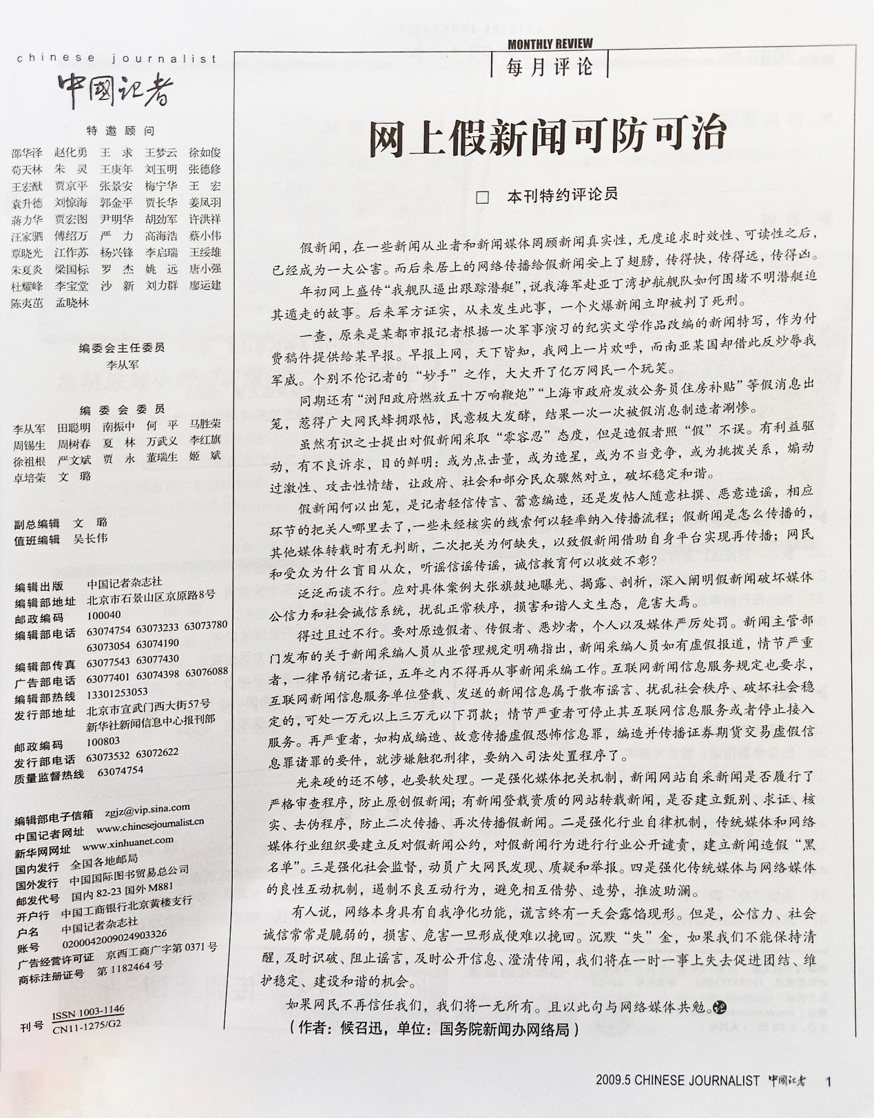 《中國記者》雜志2009年第5期“每月評論”刊發(fā)《網(wǎng)上假新聞可防可治》。