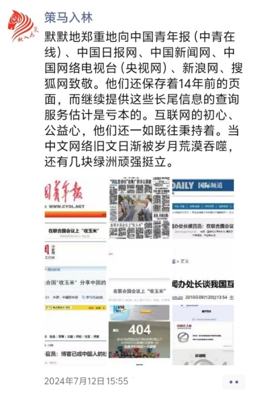 2024年7月3日,我發(fā)了一條朋友圈:前些天看到有人說網(wǎng)絡(luò)“崩塌”,有點(diǎn)著慌,馬上去找以前寫的一些帖文,真發(fā)現(xiàn)了問題。多年前可以搜到數(shù)千上萬條自己寫的稿子或與己有關(guān)的信息,現(xiàn)在去重、有用的所剩不多,還被一些收費(fèi)網(wǎng)站囤去一些,不交錢不讓看。QQ空間日志(騰訊博客)的一千多篇還在,互動也在,鏈接卻多成死鏈。新浪博客的一千多篇也在,互動沒了,考慮到博主需要,設(shè)置了備份按鈕,確實(shí)負(fù)責(zé)任。早已停服的博客中國,竟然還能打開。鏈接的新聞網(wǎng)頁還在的,有新浪網(wǎng)、中國青年報(bào)中青在線、中國日報(bào)網(wǎng)、中國新聞網(wǎng)、央視網(wǎng)、搜狐網(wǎng)等。包括人民網(wǎng)、新華網(wǎng)、中國網(wǎng)、國際在線、央廣網(wǎng)等大多數(shù)新聞網(wǎng)站及騰訊新聞、網(wǎng)易新聞、鳳凰新聞等,已經(jīng)404或403,而我最多的鏈接是人民網(wǎng)的,真是遺憾。對低效益的冷寂長尾內(nèi)容,很多網(wǎng)站平臺不愿再運(yùn)營維護(hù),便卸載斷服?!盎ヂ?lián)網(wǎng)是有記憶的”,這話需要加以限定了,十年記憶就不容易,“永久”“免費(fèi)”已是傳說。接下來,有用的盡快備份吧,不管微博微信短視頻啥的,來有影去無蹤,或終將煙消云散南柯夢。值得敬佩的是一些良心平臺,尚能以公益為重,秉持初心,堅(jiān)持至今,繼續(xù)提供信息服務(wù),不容易不簡單。