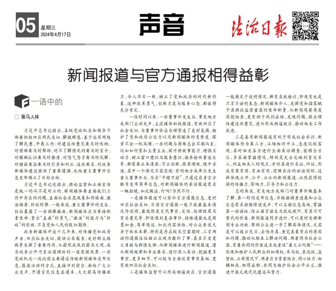 《新聞報(bào)道與官方通報(bào)相得益彰》法治日報(bào) 中國記協(xié) 2024-04-17