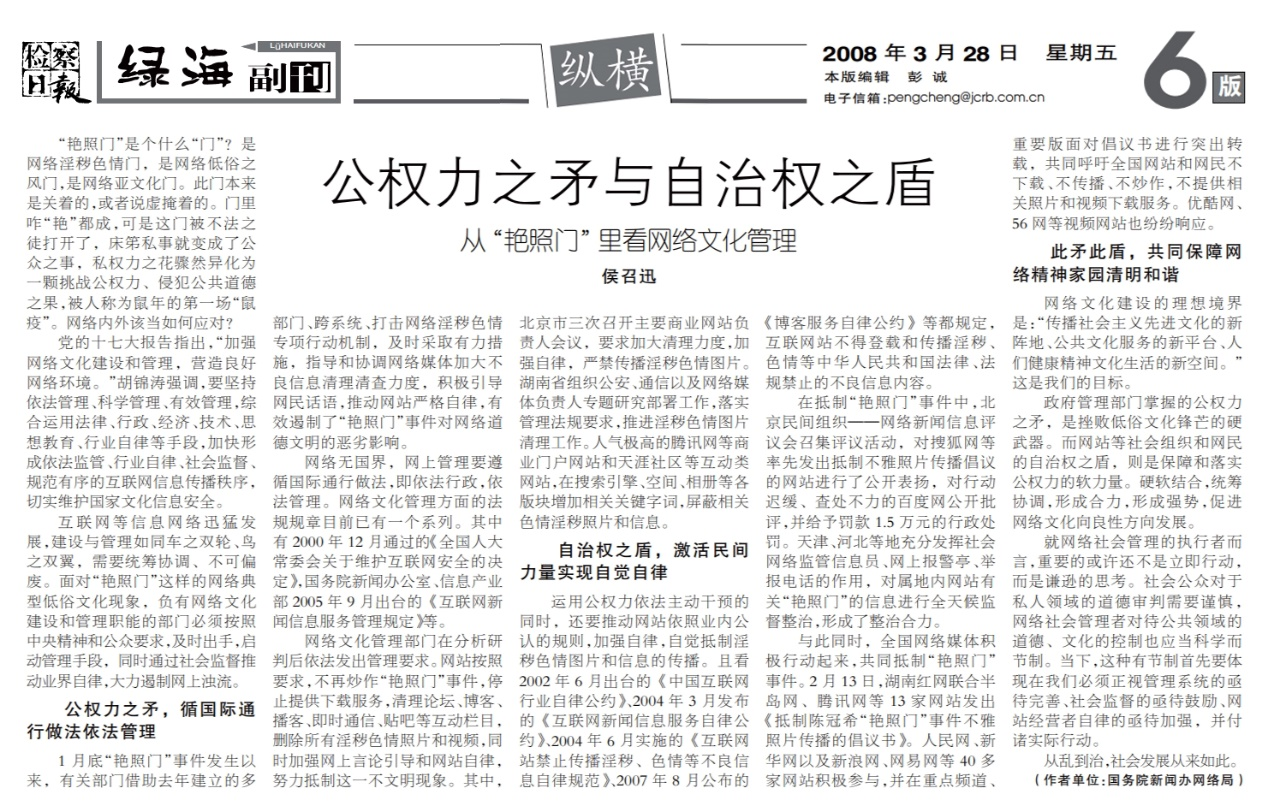 針對“艷照門”等網(wǎng)絡(luò)低俗文化現(xiàn)象的治理,撰寫《公權(quán)力之矛與自治權(quán)之盾——從“艷照門”里看網(wǎng)絡(luò)文化管理》,刊于2008年3月28日《檢察日報(bào)》。文章提出,負(fù)有網(wǎng)絡(luò)文化建設(shè)和管理職能的部門要遵循國際通行做法,依法行政,依法管理,及時(shí)出手,啟動管理手段。運(yùn)用公權(quán)力依法主動干預(yù)的同時(shí),還要推動網(wǎng)站依照業(yè)內(nèi)公認(rèn)的規(guī)則,加強(qiáng)自律,自覺抵制淫穢色情圖片和信息的傳播。政府管理部門掌握的公權(quán)力之矛,是挫敗低俗文化鋒芒的硬武器。而網(wǎng)站等社會組織和網(wǎng)民的自治權(quán)之盾,則是保障和落實(shí)公權(quán)力的軟力量。硬軟結(jié)合,統(tǒng)籌協(xié)調(diào),形成合力,促進(jìn)網(wǎng)絡(luò)文化良性發(fā)展。就網(wǎng)絡(luò)社會管理的執(zhí)行者而言,非常重要的一點(diǎn)是謙遜的思考。社會公眾對于私人領(lǐng)域的道德審判需要謹(jǐn)慎,網(wǎng)絡(luò)社會管理者對待公共領(lǐng)域的管控也應(yīng)當(dāng)科學(xué)而節(jié)制。當(dāng)下,管理系統(tǒng)亟待完善,社會監(jiān)督亟待鼓勵(lì),網(wǎng)站經(jīng)營者自律亟待加強(qiáng)。