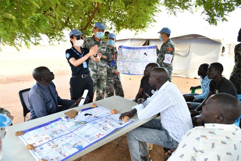 2020年3月,在南蘇丹首都朱巴,執(zhí)行聯(lián)合國維和任務(wù)的中國維和警察廖潔給當(dāng)?shù)鼐熘v解防疫知識。