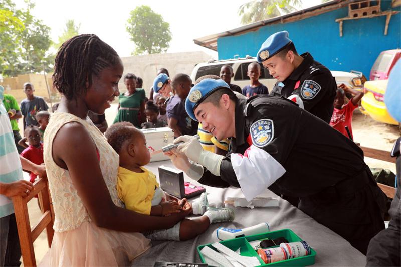 2017年12月28日,在利比里亞蒙羅維亞,中國維和警察防暴隊(duì)醫(yī)療人員為兒童做口腔檢查。