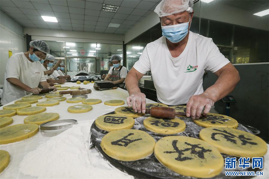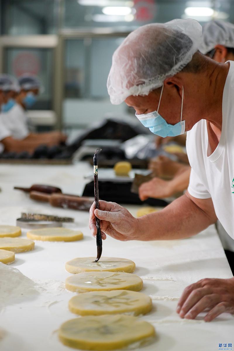 臨近中秋佳節(jié),在安徽省黃山市祁門縣,徽州制餅手藝人經(jīng)過(guò)“配料、打面皮、包餡、壓形、寫字、粘黑芝麻、上白芝麻和烘烤”等古法工序后,制成可食可賞的“徽州月餅”,深受食客喜愛(ài)。