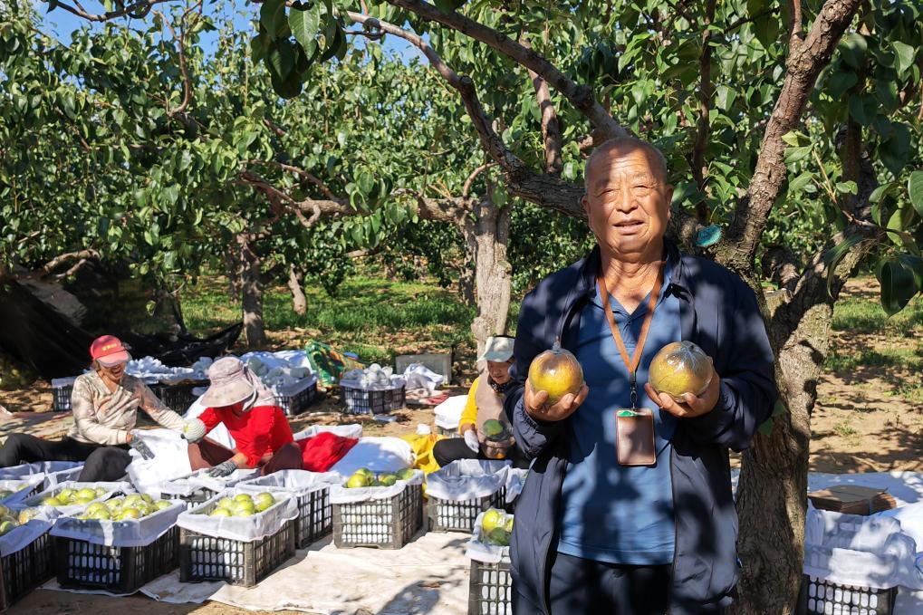 今年78歲的閆云海從20世紀(jì)80年代開始種梨,蜜梨、酥梨等品種試了個遍,最后找到梨果專家引進了玉露香梨?!坝衤断憷嫠执蟆⑻嵌?、色美、皮薄、口感好,而且耐保存。如今我們家三代人都在種玉露香梨。”閆云海說。