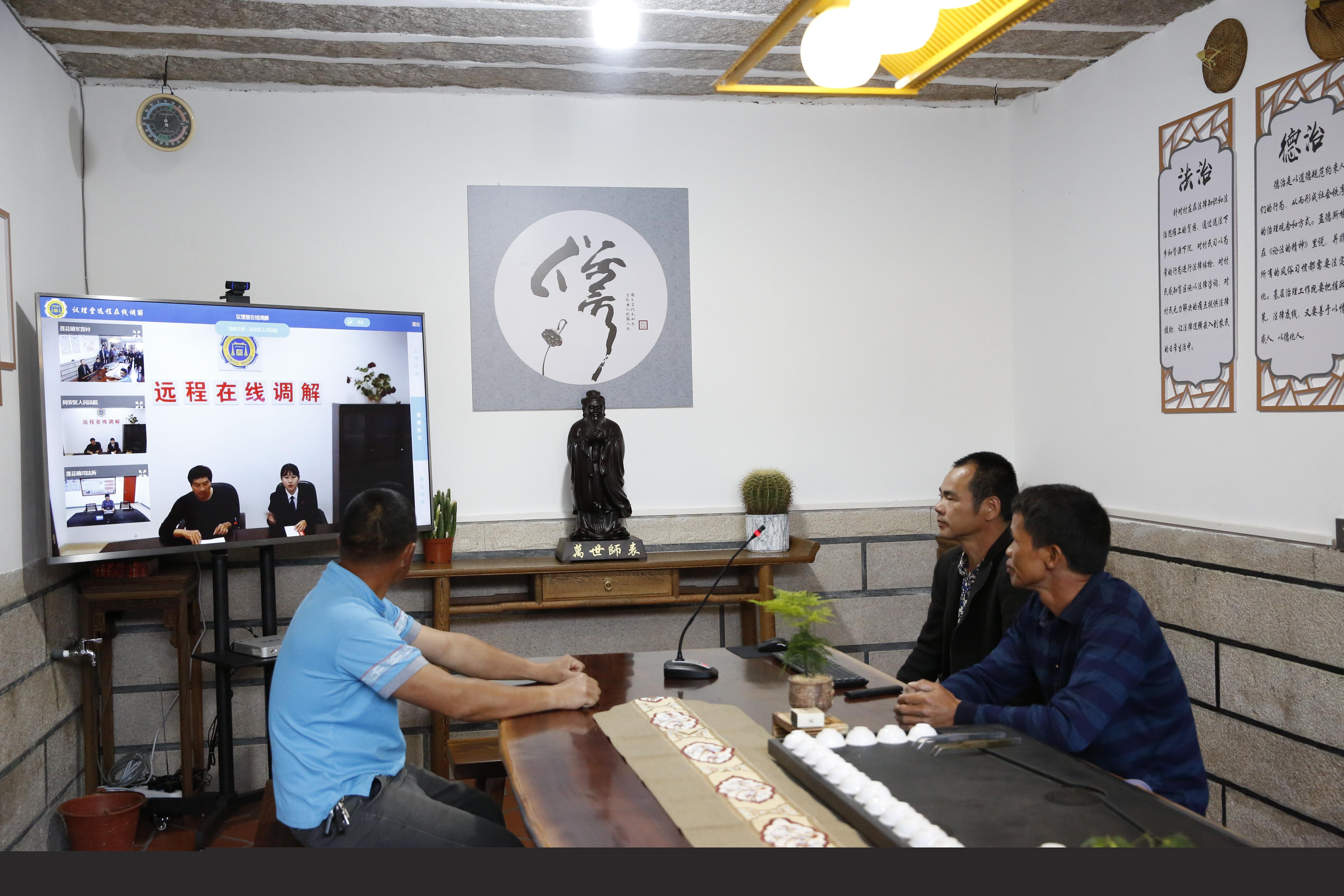 軍營村“高山議理堂”中,同安區(qū)人民法院、蓮花鎮(zhèn)司法所的工作人員正在為村民遠程調解矛盾解紛、普法。受訪者供圖