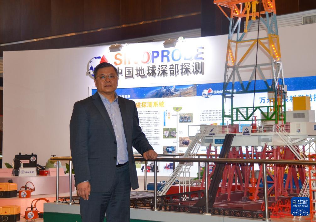 黃大年在中國地球深部探測項目年會上(2013年4月18日攝),身旁是他率領(lǐng)團隊研發(fā)的“地殼一號”萬米大陸科學(xué)鉆探機的展示模型。 新華社發(fā)
