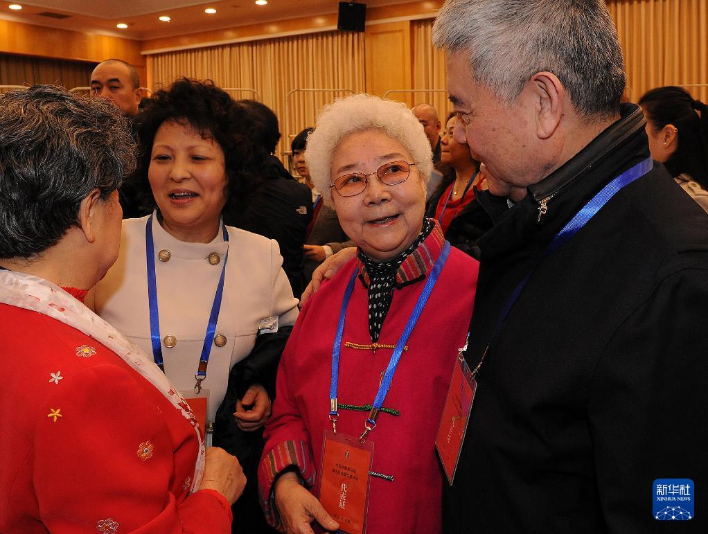 2013年11月29日,中國(guó)電影家協(xié)會(huì)第九次全國(guó)代表大會(huì)在北京開幕。這是田華(右二)在會(huì)議間隙與其他代表交流。新華社記者 何俊昌 攝