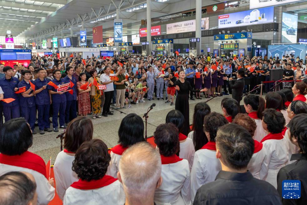 9月28日,鐵路上海站聯(lián)合中國(guó)上海國(guó)際藝術(shù)節(jié)中心在上海虹橋站候車室開展迎國(guó)慶快閃活動(dòng),演員在活動(dòng)中演唱歌曲。