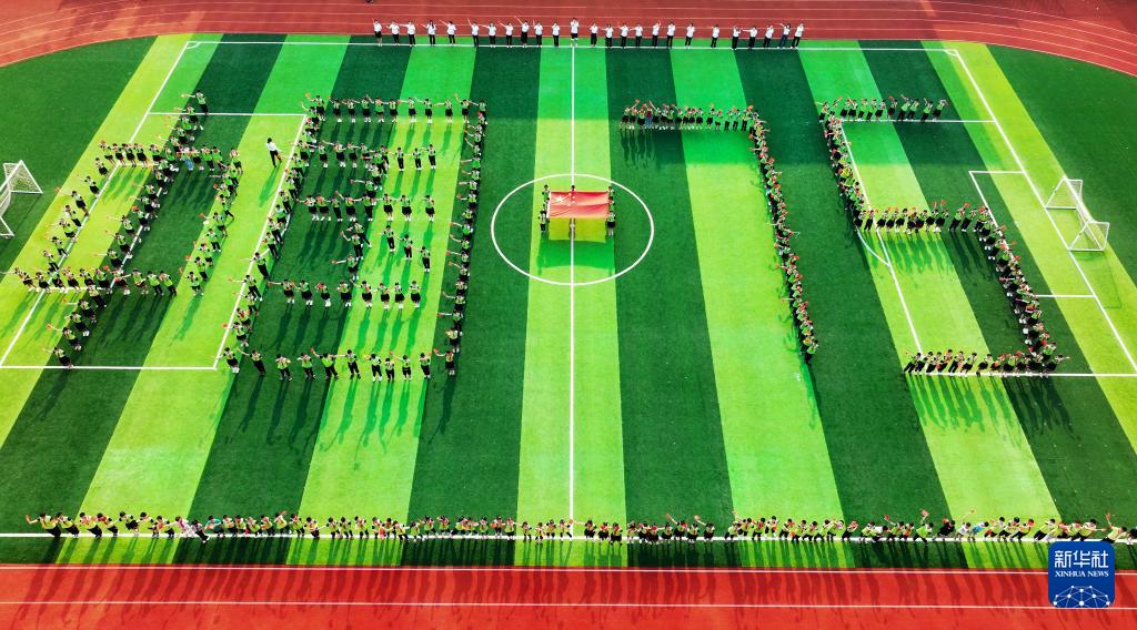9月27日,在四川省南充市蓬安縣錦屏鎮(zhèn)中心小學(xué)校迎國慶主題活動上,師生與國旗合影(無人機照片)。