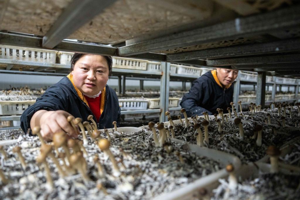 11月26日,在益陽市資陽區(qū)沙頭鎮(zhèn)富興村集體經(jīng)濟合作社基地,農(nóng)戶在采摘菌子。新華社記者阮周圍 攝