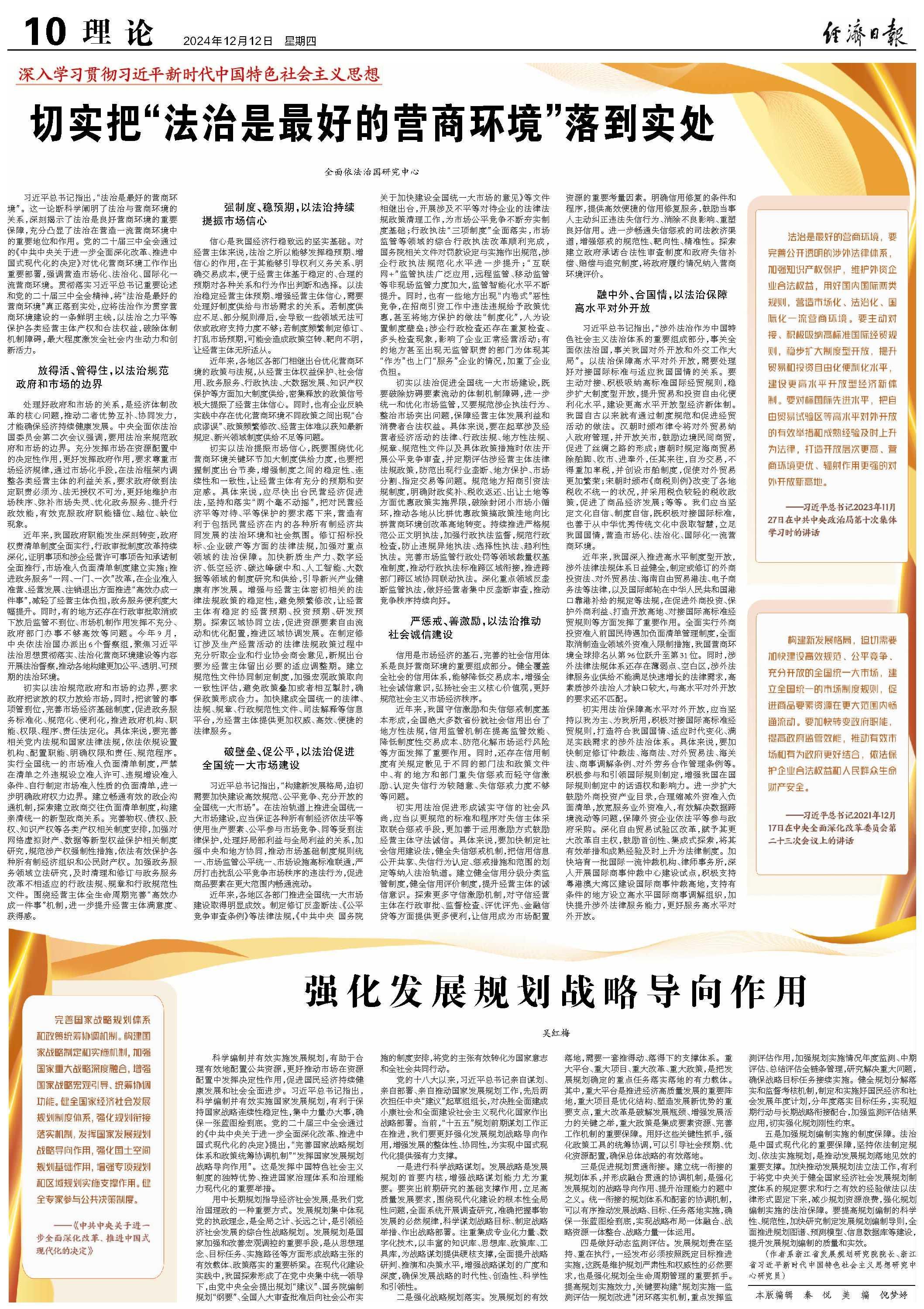 習近平總書記指出,“法治是最好的營商環(huán)境”。這一論斷科學闡明了法治與營商環(huán)境的關系,深刻揭示了法治是良好營商環(huán)境的重要保障,充分凸顯了法治在營造一流營商環(huán)境中的重要地位和作用。黨的二十屆三中全會通過的《中共中央關于進一步全面深化改革、推進中國式現(xiàn)代化的決定》對優(yōu)化營商環(huán)境工作作出重要部署,強調營造市場化、法治化、國際化一流營商環(huán)境。貫徹落實習近平總書記重要論述和黨的二十屆三中全會精神,將“法治是最好的營商環(huán)境”真正落到實處,應將法治作為貫穿營商環(huán)境建設的一條鮮明主線,以法治之力平等保護各類經營主體產權和合法權益,破除體制機制障礙,最大程度激發(fā)全社會內生動力和創(chuàng)新活力。