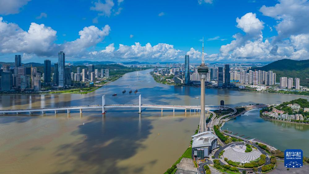 這是7月8日拍攝的澳門半島、橫琴及珠海景色(無人機(jī)照片)。新華社發(fā)(張金加 攝)