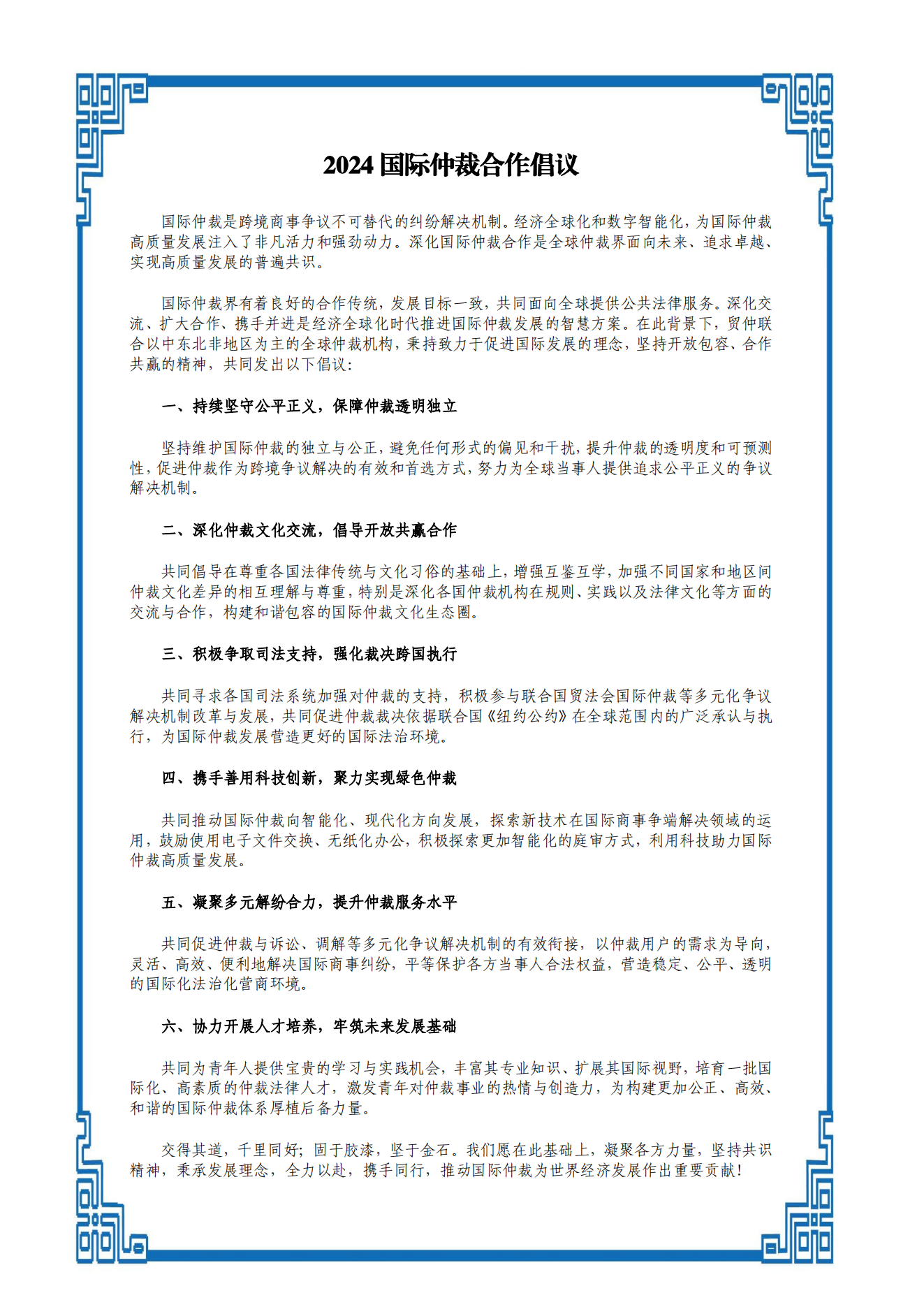 附《2024國際仲裁合作倡議》主要內(nèi)容: