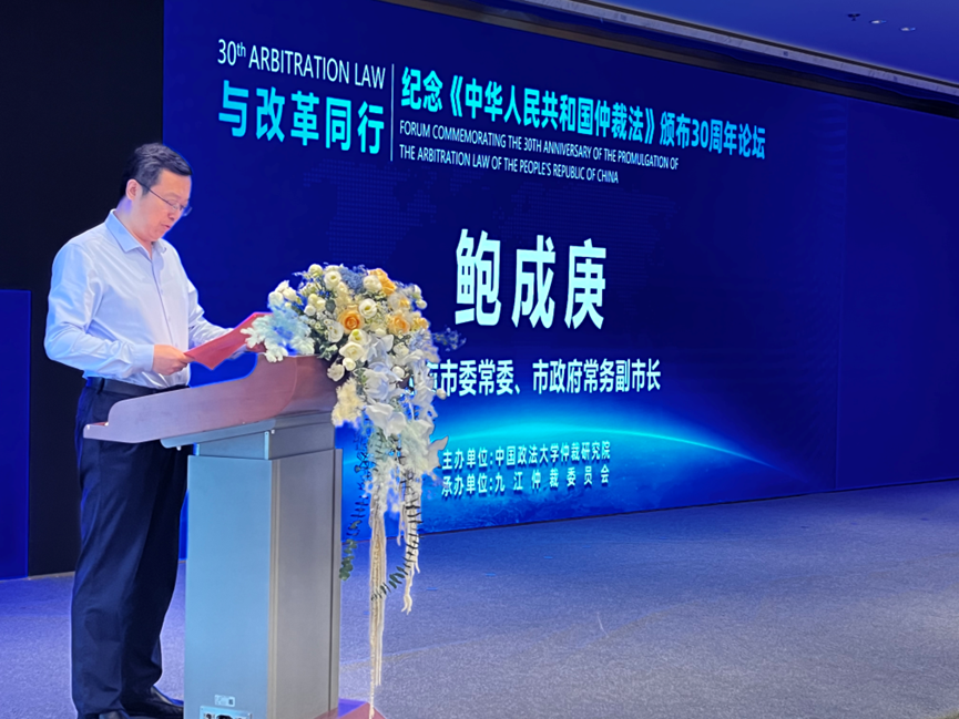 論壇由中國政法大學(xué)仲裁研究院院長杜新麗主持。九江市委常委、市政府常務(wù)副市長鮑成庚,全國人大常委會法工委民法室副主任馬正平先后發(fā)表致辭。