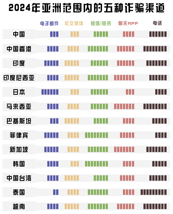 從GASA發(fā)布的《2024年亞洲詐騙報(bào)告》來(lái)看,在13個(gè)國(guó)家及地區(qū)中,犯罪分子實(shí)施詐騙的渠道通常有如下五種:電子郵件、社交媒體、短信及短訊、聊天APP、電話。